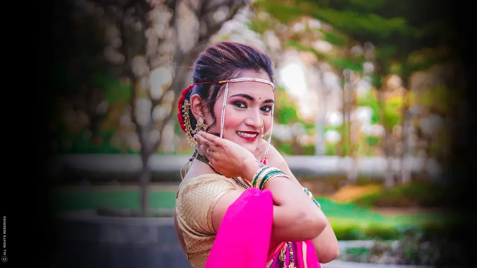 Maharashtrian bridal makeup is a traditional and popular form of bridal makeup in Maharashtra. The bride wears a red bindi, kumkum and Mandavliya on her forehead, and sindoor in the parting of her hair. The bride’s face is usually made up with kajal or surma around the eyes. In some cases, she may also wear false eyelashes. Maharashtrian Bride usually applied mehndi designs on her hand and feet and she wears heavy gold jewelry.